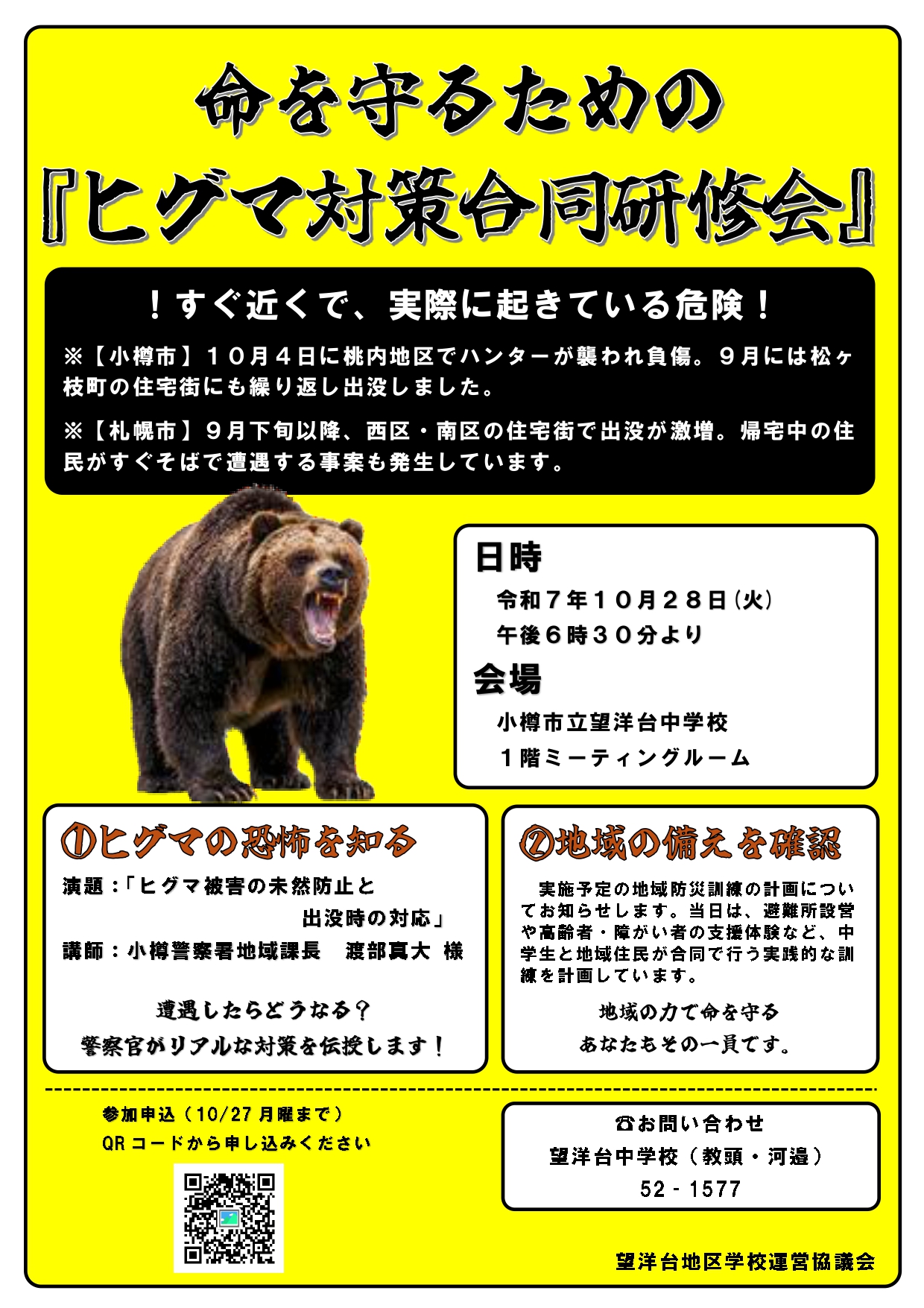 【お知らせ】望洋台地区学校運営協議会「ヒグマ対策合同研修会」のお知らせ 2025年10月24日 下記URLをクリックすれば、申込フォームに進みます。 https://forms.gle/Q8pAFxGo1fPQzb7t6 戻る