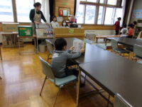 ♦ 2月10日に、保護者説明会と新1年生体験入学を行いました。保護者の皆様には、学校の生活、学校の教育活動のねらい、入学式までに用意するもの、生活習慣の指導など、入学前に不安なことがなくなるように説明いたしました。教室では、現1年生が優しく丁寧に新1年生に除菌シートで糸をこするとコケコッコーとなる工作を作りました。現1年生は、みんなお兄さんお姉さんとなり、新1年生が困っていないか積極的に声をかけていました。