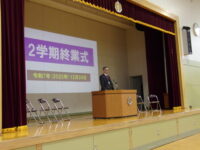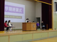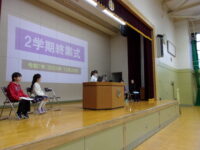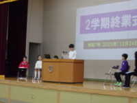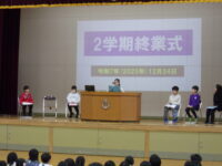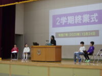 体育館で2学期の終業式を実施しました。各学年より2学期に頑張った授業・行事などを発表。その後、校長先生から、2学期の頑張りや成長についてのお話があり、児童のみなさんは真剣な表情で耳を傾けていました。明日から冬休みです。安全に過ごし、楽しい休みを過ごしてください。3学期の始業式で元気に会いましょう!
