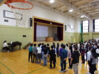 ♦ 3月全校朝会を体育館で行いました。まず、来年度の児童会三役の認証式を行い、認証状を校長先生より授与されました。次に、新児童会三役を代表し、児童会長より決意として「お互いの良い所を見つけられるような活動が出来るように、全員で協力していきます。」と述べられました。校長先生より「今年度も残り数日ですが、「気持ちの良い挨拶をする」「廊下を静かに歩く」「学校のものを大切にする」を意識して、卒業式・修了式に向けて最後の3月頑張っていきましょう。そして、先生と今年度を振り返り、残り少ない毎日を充実させて良い締めくくりをしていきましょう。」とお話がありました。