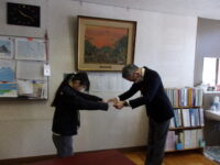 中休み・昼休み時間を使って、2年生の生徒が「かけ算の九九」の練習をしています。九九を上から順番「のぼり九九」下から順番「くだり九九」の2種類。正確かつ上手く言えると、先生のサイン・ハンコを貰えます。全部ハンコを貰えると「ラスボス」として校長先生の九九の難題を答えなくてはなりません!難しいけどみんな頑張って九九を覚えてください!