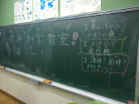 今回の教室では、身近な材料を使いながら、科学の不思議に楽しく触れる3つの実験・工作を行いました。1つ目は「水に浮かぶ ひみつの絵」。ホワイトボード用マーカーで描いた絵が水に浮かぶ様子に、子どもたちは