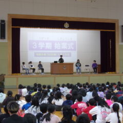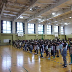 体育館で2学期の終業式を実施しました。各学年より2学期に頑張った授業・行事などを発表。その後、校長先生から、2学期の頑張りや成長についてのお話があり、児童のみなさんは真剣な表情で耳を傾けていました。明日から冬休みです。安全に過ごし、楽しい休みを過ごしてください。3学期の始業式で元気に会いましょう!