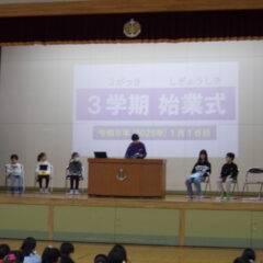 ♦ 3学期始業式は、まず各学年代表児童より冬休みの思い出と3学期に頑張りたいことを発表しました。その後、児童会より「いじめのない学校にするために、一人一人が相手を思いやり傷つけない、みんなで楽しむことを意識していきましょう。」とお話がありました。校長先生からは「3学期に学校生活で頑張ってほしい事として、「仲間と協力すること」「自分から挨拶すること」「事故に気を付けて登校すること」「友達を思いやること」を頑張ってください。また、授業では「話をしっかり聞く」「考えたことを伝える、説明をする」「自分だけで学習する力をつける」を意識してください。短い3学期では、自分がどうなりたいか、どう成長したいか、めあてを決めて過ごし、笑顔が溢れ仲間と頑張る姿がたくさん見られる3学期にしてください。」とお話がありました。