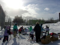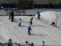 ♦ 1年生スキーを学校グラウンドで行いました。初めてのグラウンド山でのスキー学習。今年は雪が少なく、土が見えているところもありましたが、天気に恵まれた中スキー学習を終えました。また、保護者のサポーターの方も準備から片づけまでお手伝いいただきました。ありがとうございました。