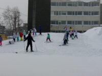 ♦ 2回目の1年生スキー学習をグラウンドで行いました。1回目よりも上達した姿がたくさん見られました。たくさん汗をかいて、楽しみながらスキーを練習しました。スキーサポーターの保護者の皆様もご参加いただき、お手伝いをしていただきました。ありがとうございました。