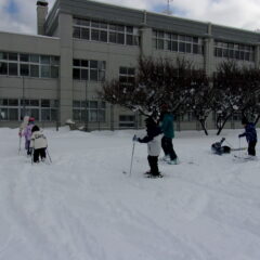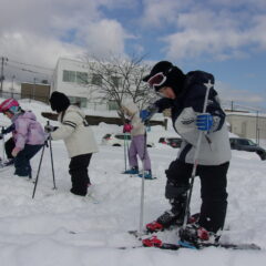 積雪した学校グラウンドで、スキーの基礎を中心に学びました。はじめは慎重に滑っていた児童も、回数を重ねるごとにバランスよく滑れるようになり、元気いっぱい取り組む姿が見られました。
