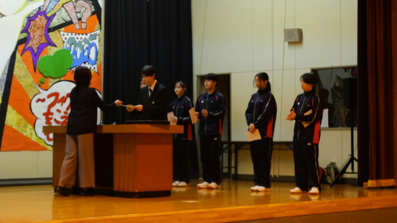 4月14日(月)の午後、全校生徒が参加し、学級三役と各専門委員の認証式を実施しました。新しく認証された生徒一人一人が紹介され、校長先生から認証書を受け取りました。前期にの学級・学年・学校づくりに向けた皆さんの活躍を期待しています。