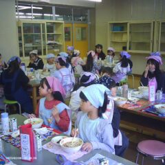 12月2日(火)の給食では3年生と5年生の交流給食を実施しました。交流給食は複数の学年が家庭科室で一緒に給食を食べることで交流を図り、身支度や給食のマナーについて改めて確認することを目的としています。