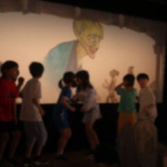 子どもたちは、劇団が持ち込んだ大きなスクリーンに映し出される影絵の迫力に引き込まれていました。特に、お馴染みの妖怪たちが登場する物語に、夢中になって見入っていました。